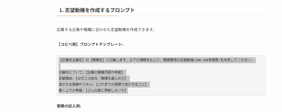 プロンプト集の記事から、使いたいプロンプトをコピーします。