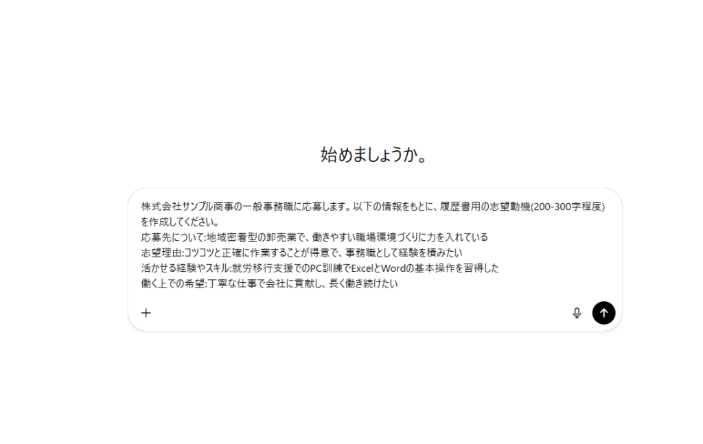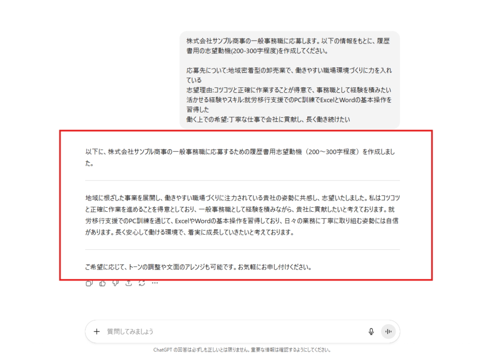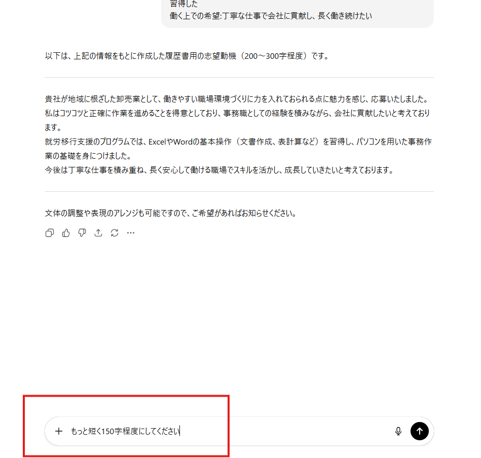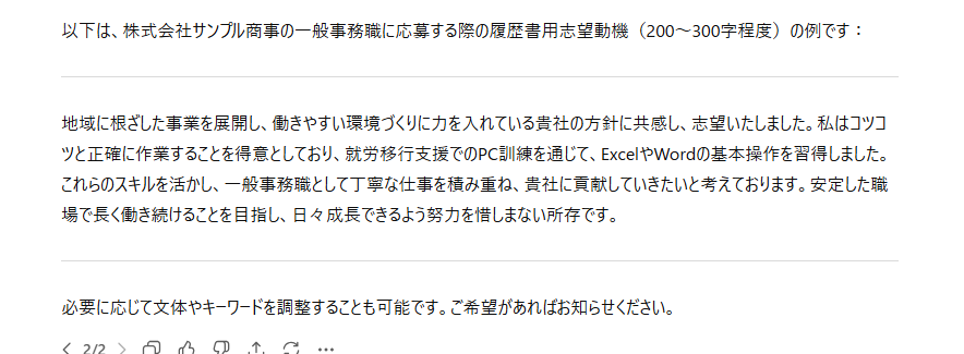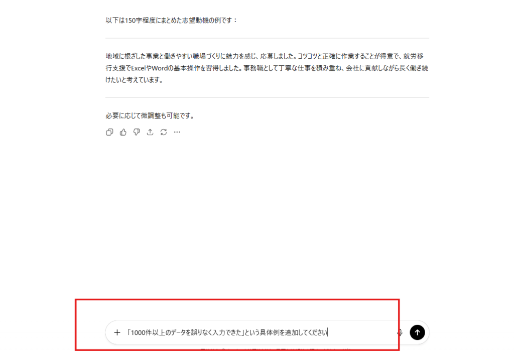 - 「先ほどの回答で、【企業名】を『株式会社〇〇』に、【職種】を『事務職』に置き換えてください」と追加指示する