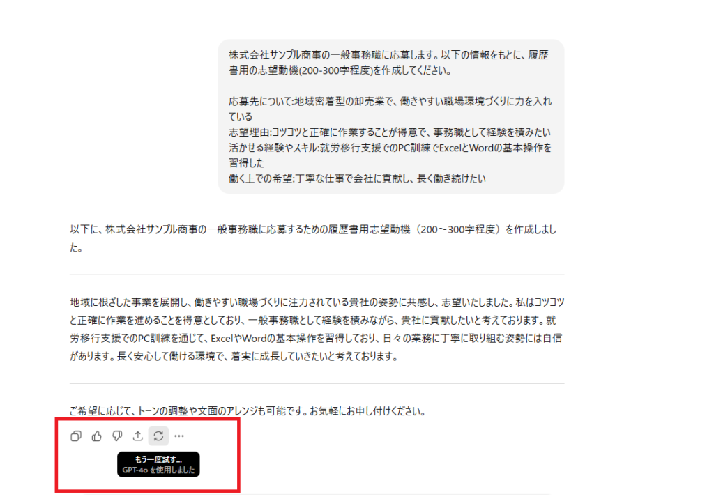 ポイント: 毎回違う回答が生成されるので、何度か試して気に入ったものを選びましょう。
